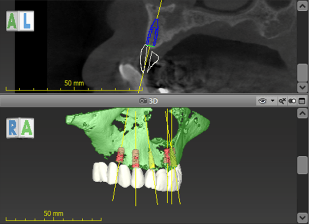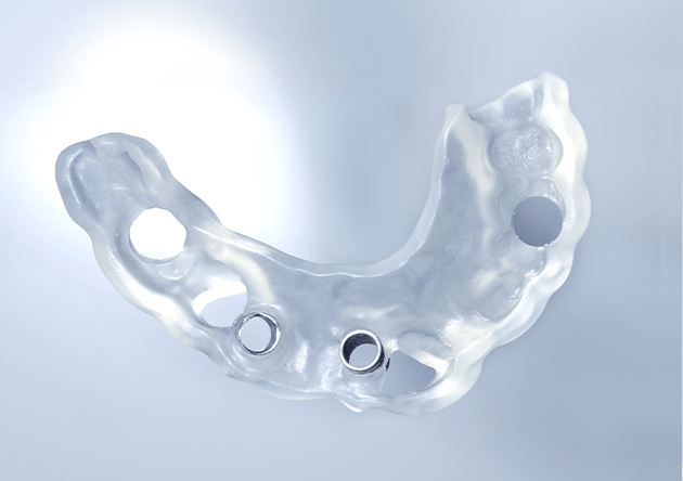 CTデータと口腔内の歯のデジタルスキャンデータを重ね合わせ、ドクターと放射線技師が骨の中でのインプラントの設置位置のシミュレーションを行います。それをもとに歯科技工士がガイデッドサージェリー用のテンプレート(サージカルガイド)を作製し、精度の高いインプラントオペを実施しています。このオペ様式により、術中と、術後の痛みの少ないインプラントオペが可能となります。